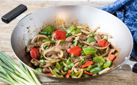 Add the bell peppers and onion to the center of the wok, stirring until lightly charred (about 30 seconds). Toss with the beef and push back to the sides.